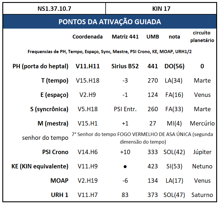 Hoje é NS1.37.10.7, KIN 17, terra autoexistente vermelha. 4o KIN da onda encantada do(a) mago, 2a onda do Tzolkin, 2a onda do castelo vermelho. castelo 1 do Tzolkin 53 do caminhante do céu magnético vermelho. anel 37 da tormenta rítmica azul. 10a lua deste anel, lua planetária do cachorro. heptal 37 vermelho, o conhecimento inicia a visão. Plasma SILIO, 7a porta do heptal, ativamos a 7a esfera mental com o SIRIUS B52. ativação cúbica no centro giratório do cubo. circuíto 8 solar profético no hipercubo, fluxos interplanetários: o Circuito 8 é o circuito Elétrico do Hiperparton, coordena a eletricidade Cósmica de qualquer corpo celeste, Arquétipos o Navegador e a Suma Sacerdotisa, acessa o Conselho Uraniano de Comunicação Evolutiva.