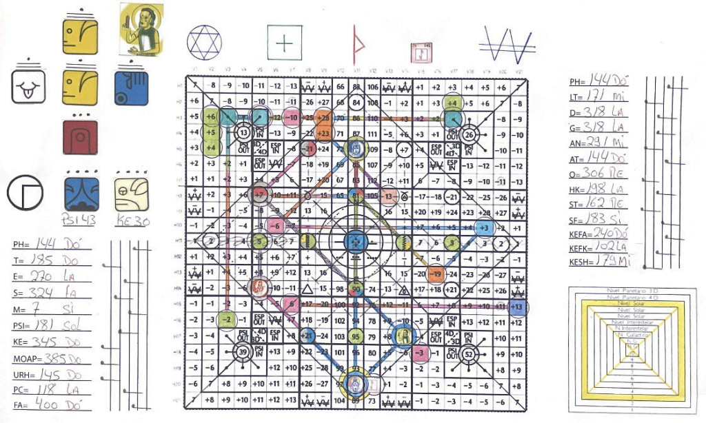 A Matriz S (syncronica), V. 16, H. 13. UMB 324. (-19) Decima nona magnitude do fluxo do espaço externo sublima o hiperplasma Beta-Beta do Cubo Cósmico (na 4ª dimensão do tempo exterior). Campo de força da mediunidade do consciente desperto (4D) sublimado pelo campo de força lumínico Duar azul do consciente Subliminar (6D).