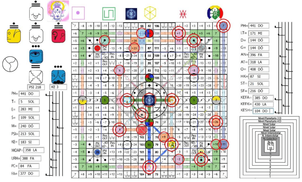 PH, V. 11, H. 11. UMB 441. 9ª Estação da Arca: Noé, Pacal (e Valum) Votan—arquetipo dos mensageiros do tempo e do sistema do Cubo. Canal 11º dimensional a partir do qual se originam a totalidade dos padrões do sistema de pensamento e vida Galáctica do cubo. A partir daqui para o corpo calloso flui o hiperplasma concentrado radialmente Sirio B-52/Elemento 113. Hunab Ku 21: Mago do Infinito. Matriz central do canal do universo, a luz-fotón-ciclón do poder de quinta força. Assento da Unidade da totalidade. A partir do portal de Hunab Ku 21 é gerado o hiperplasma Sirio B-52/Elemento 113 que estimula os estados de consciência e percepção radial e ativa as forças centrípeta e centrífuga como as energias cósmicas primarias. 11ª Porta de Unidade: Omnidirecionalidade.