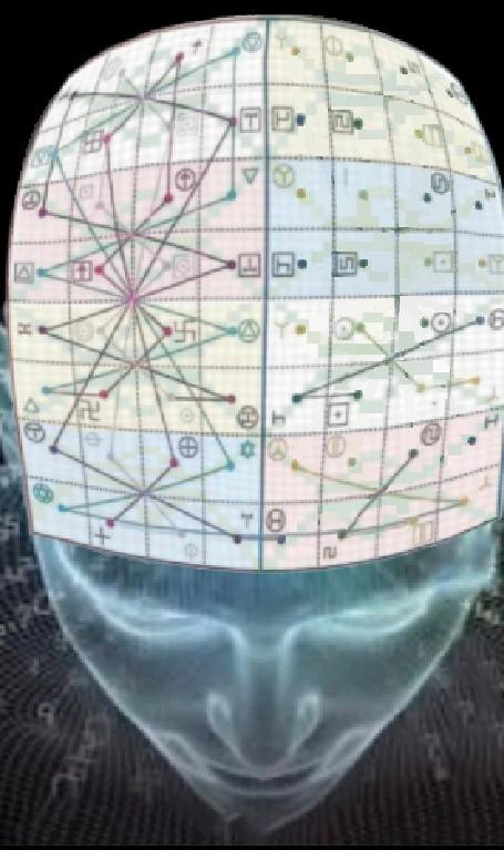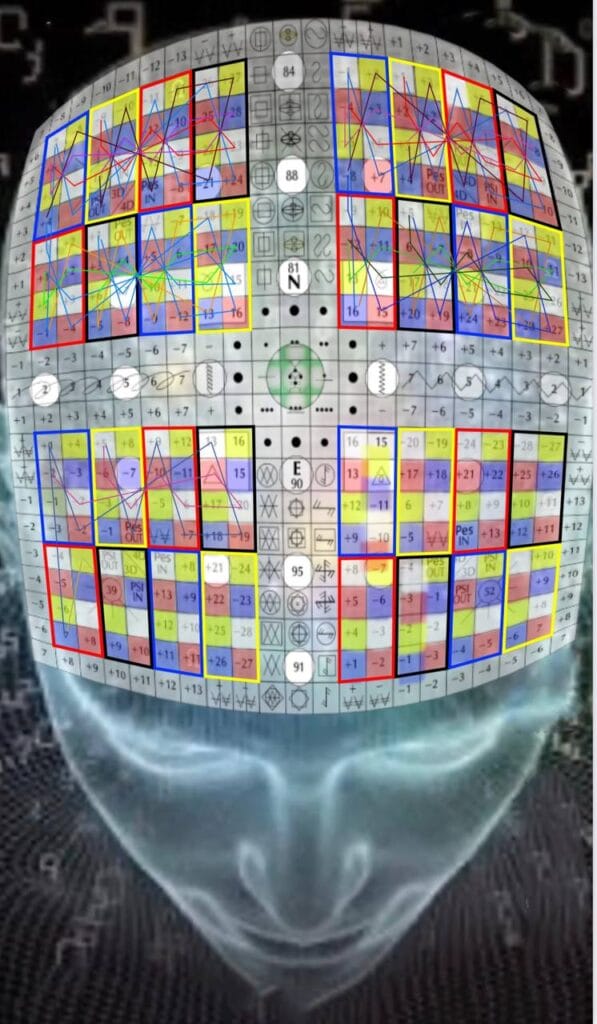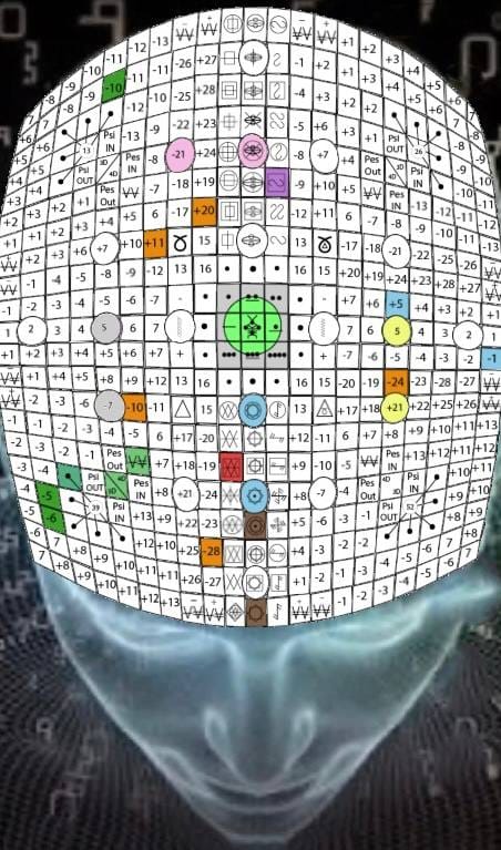 E (espaço), V.3, H.17. UMB 199. Matriz do núcleo dos sentidos de quinta força. “Tato da Sincronização Cósmica” organiza e coordena o espectro psicofísico inteiro da consciência tátil (interna, externa e etérica) no canal Alfa-Beta.
