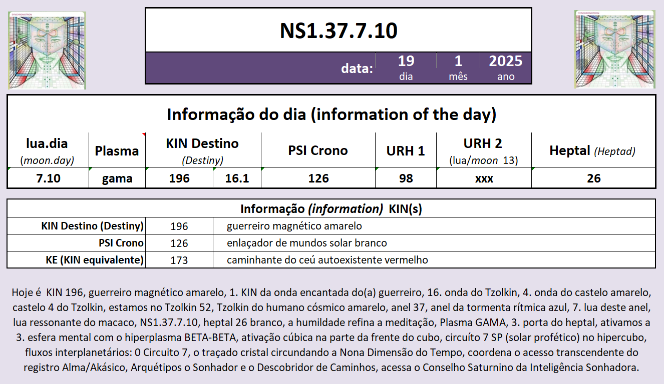 Hoje é KIN 196, guerreiro magnético amarelo, 1. KIN da onda encantada do(a) guerreiro, 16. onda do Tzolkin, 4. onda do castelo amarelo, castelo 4 do Tzolkin, estamos no Tzolkin 52, Tzolkin do humano cósmico amarelo, anel 37, anel da tormenta rítmica azul, 7. lua deste anel, lua ressonante do macaco, NS1.37.7.10, heptal 26 branco, a humildade refina a meditação, Plasma GAMA, 3. porta do heptal, ativamos a 3. esfera mental com o hiperplasma BETA-BETA, ativação cúbica na parte da frente do cubo, circuíto 7 SP (solar profético) no hipercubo, fluxos interplanetários: 0 Circuito 7, o traçado cristal circundando a Nona Dimensão do Tempo, coordena o acesso transcendente do registro Alma/Akásico, Arquétipos o Sonhador e o Descobridor de Caminhos, acessa o Conselho Saturnino da Inteligência Sonhadora.
