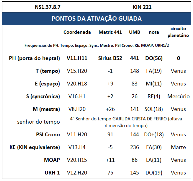 Hoje é NS1.37.8.7, KIN 221, dragão cósmico vermelho. 13a KIN da onda encantada do(a) lua, 17a onda do Tzolkin, 1a onda do castelo verde. castelo 5 do Tzolkin 52 do humano cósmico amarelo. anel 37 da tormenta rítmica azul. 8a lua deste anel, lua galáctica do falcão. heptal 29 vermelho, o conhecimento inicia a visão. Plasma SILIO, 7a porta do heptal, ativamos a 7a esfera mental com o SIRIUS B52. ativação cúbica no centro giratório do cubo. circuíto 9 galático karmico no hipercubo, fluxos interplanetários: o Circuito 9 é o mantenedor das memórias arquetípicas da consciência oceânica, coordena o interior autoexistente do núcleo da Nona Dimensão do coração radiante, Arquétipos Yogue/Yoguine e a Força Primordial, acessa o Conselho Netuniano da Memória autorreflexiva.