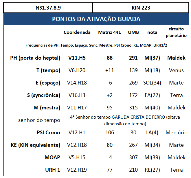 Hoje é NS1.37.8.9, KIN 223, noite lunar azul. 2a KIN da onda encantada do(a) vento, 18a onda do Tzolkin, 2a onda do castelo verde. castelo 5 do Tzolkin 52 do humano cósmico amarelo. anel 37 da tormenta rítmica azul. 8a lua deste anel, lua galáctica do falcão. heptal 30 branco, a humildade refina a meditação. Plasma SELI, 2a porta do heptal, ativamos a 2a esfera mental com o hiperplasma ALFA-BETA. ativação cúbica na parte de baixo do cubo. circuíto 7 galático karmico no hipercubo, fluxos interplanetários: 0 Circuito 7, o traçado cristal circundando a Nona Dimensão do Tempo, coordena o acesso transcendente do registro Alma/Akásico, Arquétipos o Sonhador e o Descobridor de Caminhos, acessa o Conselho Saturnino da Inteligência Sonhadora.
