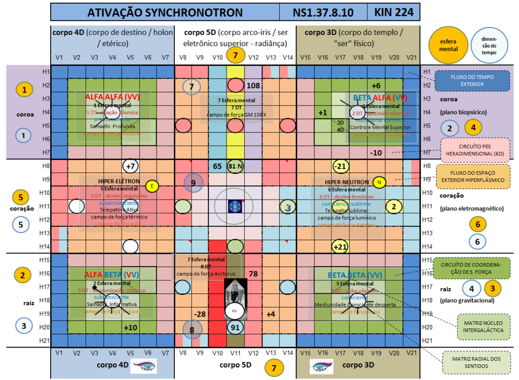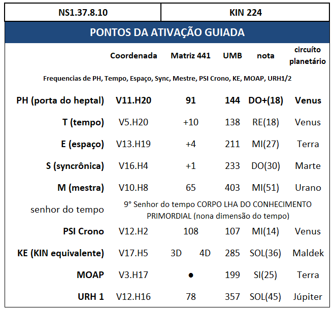 Hoje é NS1.37.8.10, KIN 224, semente elétrica amarela. 3a KIN da onda encantada do(a) vento, 18a onda do Tzolkin, 2a onda do castelo verde. castelo 5 do Tzolkin 52 do humano cósmico amarelo. anel 37 da tormenta rítmica azul. 8a lua deste anel, lua galáctica do falcão. heptal 30 branco, a humildade refina a meditação. Plasma GAMA, 3a porta do heptal, ativamos a 3a esfera mental com o hiperplasma BETA-BETA. ativação cúbica na parte da frente do cubo. circuíto 6 galático karmico no hipercubo, fluxos interplanetários: o Circuito 6 é o circuito interno da unidade exterior, coordena a consciência Cósmica do Corpo de Luz Hexadimensional e transferência de informação PES, Arquétipos o Inocente e o Vidente, acessa o Conselho Jupiteriano do Florescimento Criativo.
