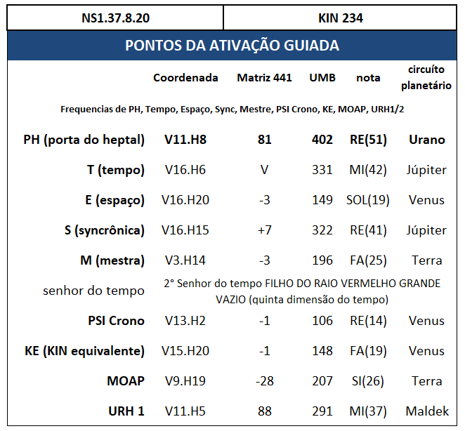 Hoje é NS1.37.8.20, KIN 234, mago cósmico branco. 13a KIN da onda encantada do(a) vento, 18a onda do Tzolkin, 2a onda do castelo verde. castelo 5 do Tzolkin 52 do humano cósmico amarelo. anel 37 da tormenta rítmica azul. 8a lua deste anel, lua galáctica do falcão. heptal 31 azul, a paciência transforma a conduta. Plasma LIMI, 6a porta do heptal, ativamos a 6a esfera mental com o hiperplasma HIPERNEUTRON. ativação cúbica no lado esquerdo do cubo. circuíto 5 solar profético no hipercubo, fluxos interplanetários: o Circuito 5 contém o “acorde perdido” e a frequência harmônica das 6 oitavas(48=6×8) coordena a informação sensorial/extra-sensorial pentadimensional, Arquétipos o Iniciado Serpente e o Mago, acessa o Conselho Maldekiano do Sexo Atemporal.