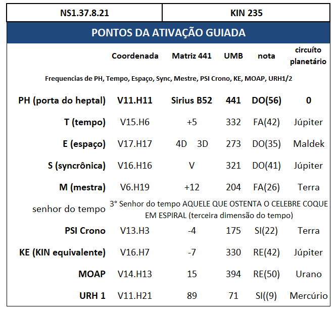 Hoje é NS1.37.8.21, KIN 235, águia magnética azul. 1a KIN da onda encantada do(a) águia, 19a onda do Tzolkin, 3a onda do castelo verde. castelo 5 do Tzolkin 52 do humano cósmico amarelo. anel 37 da tormenta rítmica azul. 8a lua deste anel, lua galáctica do falcão. heptal 31 azul, a paciência transforma a conduta. Plasma SILIO, 7a porta do heptal, ativamos a 7a esfera mental com o SIRIUS B52. ativação cúbica no centro giratório do cubo. circuíto 6 solar profético no hipercubo, fluxos interplanetários: o Circuito 6 é o circuito interno da unidade exterior, coordena a consciência Cósmica do Corpo de Luz Hexadimensional e transferência de informação PES, Arquétipos o Inocente e o Vidente, acessa o Conselho Jupiteriano do Florescimento Criativo.