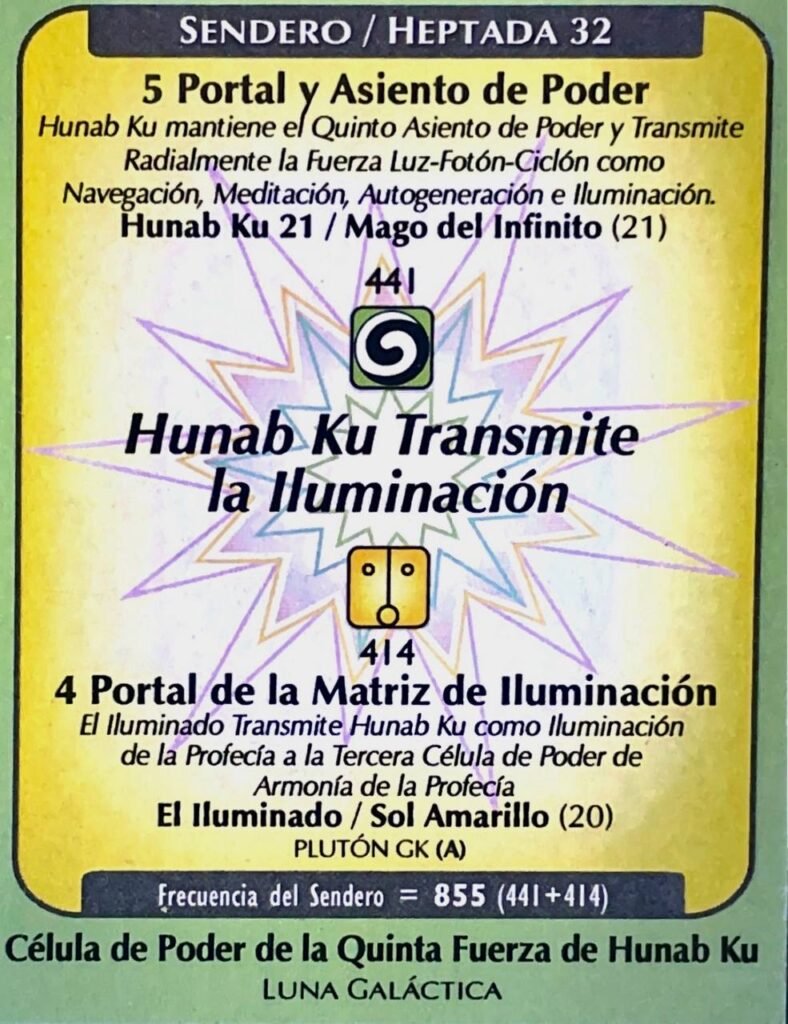 A URH, V. 11, H. 14. UMB 414. Runa Harmônica UR 90: O Todo da Arte Galáctica é Definida pelo Tempo. 4ªOitava: Oitava do Todo da Arte Galáctico. Runa da Fila 12. Oitava porta de Unidade do tempo vertical ascendente. Corresponde ao Iluminado (Sol): Quarto Portal da Matriz de Hunab Ku 21. O Sol mede a força da luz-fotón-ciclón de Hunab Ku com a linha de força centrípeta lumínica Dum Duar e a linha de força lumínico-térmica centrípeta de Kemio. A partir daqui é gerado Hiperelectron que estimula os estados da mente superconsciente. Ativa a célula de harmônia polar,
