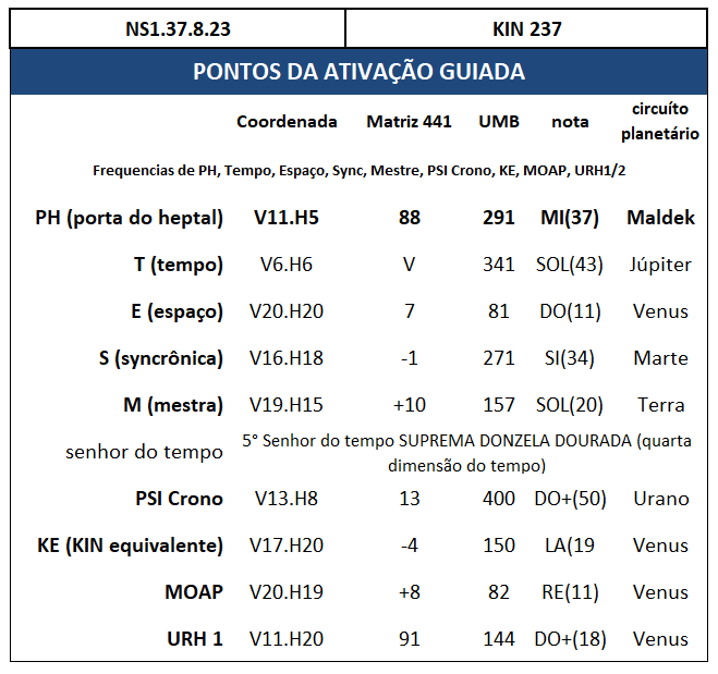 Hoje é NS1.37.8.23, KIN 237, terra elétrica vermelha. 3a KIN da onda encantada do(a) águia, 19a onda do Tzolkin, 3a onda do castelo verde. castelo 5 do Tzolkin 52 do humano cósmico amarelo. anel 37 da tormenta rítmica azul. 8a lua deste anel, lua galáctica do falcão. heptal 32 amarelo, o poder amadurece o fruto. Plasma SELI, 2a porta do heptal, ativamos a 2a esfera mental com o hiperplasma ALFA-BETA. ativação cúbica na parte de baixo do cubo. circuíto 8 solar profético no hipercubo, fluxos interplanetários: o Circuito 8 é o circuito Elétrico do Hiperparton, coordena a eletricidade Cósmica de qualquer corpo celeste, Arquétipos o Navegador e a Suma Sacerdotisa, acessa o Conselho Uraniano de Comunicação Evolutiva.