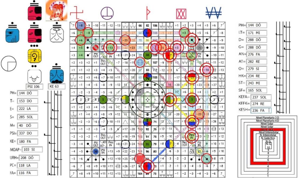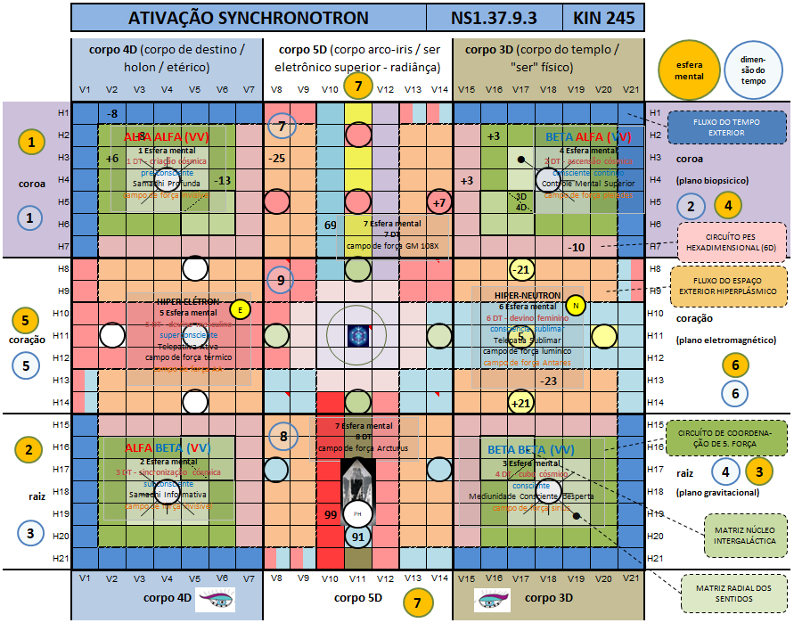 5.9 Na Matriz do Tempo (no centro das 9 unidades do núcleo radial dos sentidos) estão as “quatro unidades mestras do tempo”, localizadas nas Quatro Dimensões do Tempo Exterior: Criação Cósmica (13), UMB 245, Ascensão Cósmica (26), UMB 231, Sincronização Cósmica (39), UMB 259, e Cubo Cósmico (52), UMB 217.