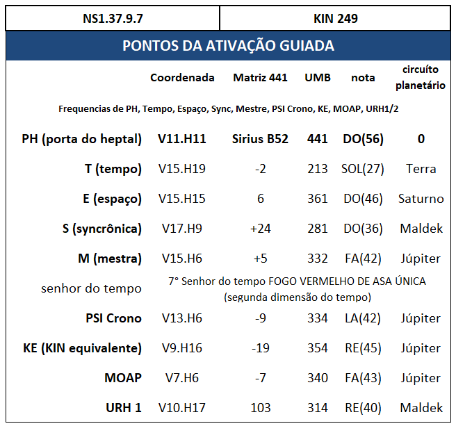 Hoje é NS1.37.9.7, KIN 249, lua lunar vermelha. 2a KIN da onda encantada do(a) estrela, 20a onda do Tzolkin, 4a onda do castelo verde. castelo 5 do Tzolkin 52 do humano cósmico amarelo. anel 37 da tormenta rítmica azul. 9a lua deste anel, lua solar do jaguar. heptal 33 vermelho, o conhecimento inicia a visão. Plasma SILIO, 7a porta do heptal, ativamos a 7a esfera mental com o SIRIUS B52. ativação cúbica no centro giratório do cubo. circuíto 1 galático karmico no hipercubo, fluxos interplanetários: o Circuito 1 é o abrangente circuito Exterior da Unidade, coordena as mudanças na manifestação Exterior da forma, Arquétipo a Curadora e o Compassivo, acessa o Conselho Mercurial do coração purificado.