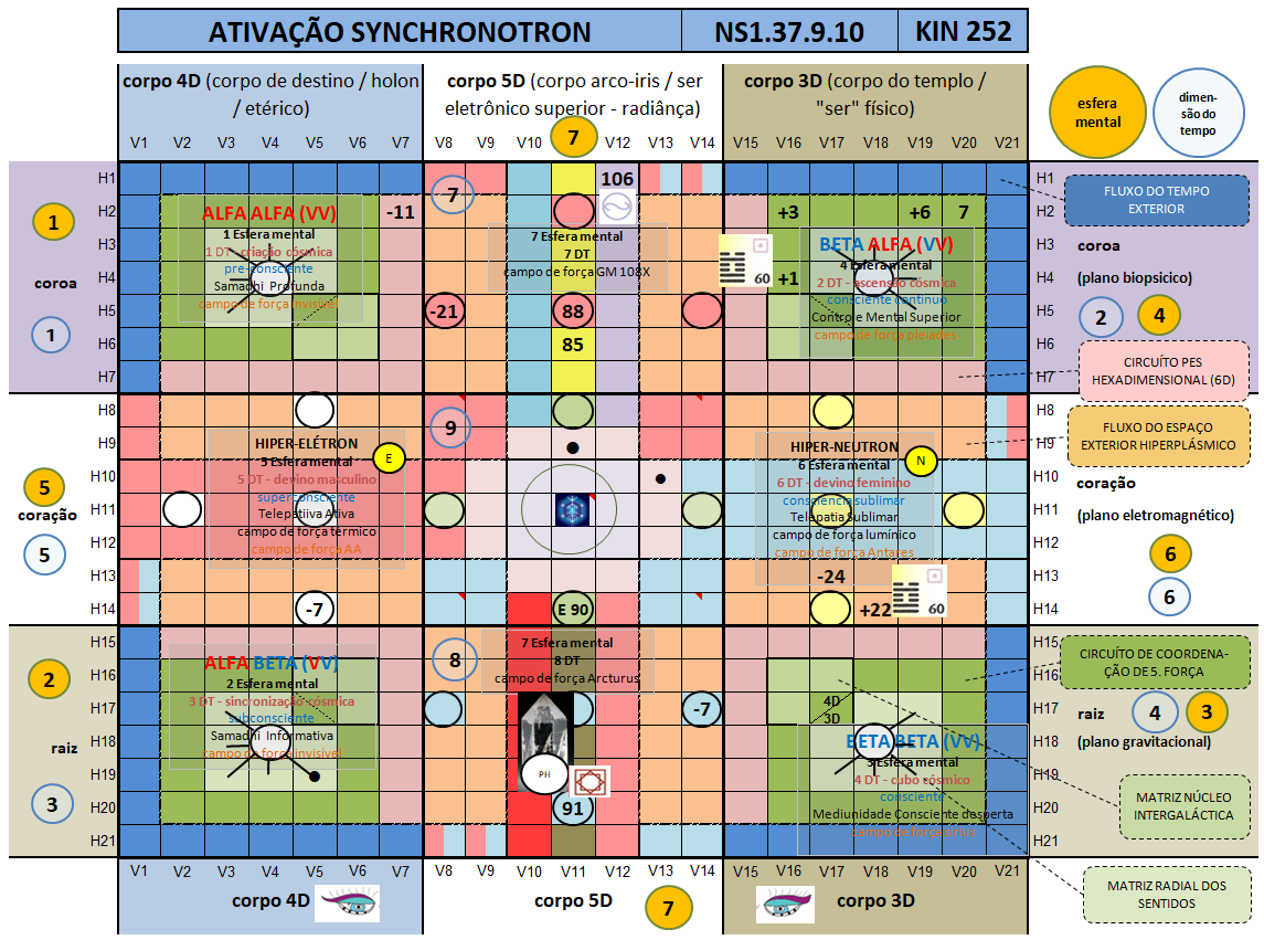T (tempo), V.5, H.19. UMB 203. Matriz do núcleo dos sentidos de quinta força. “Visão da Sincronização Cósmica” organiza e coordena o espectro psicofísico inteiro da consciência visual (interna, externa e etérica) no canal Alfa-Beta.