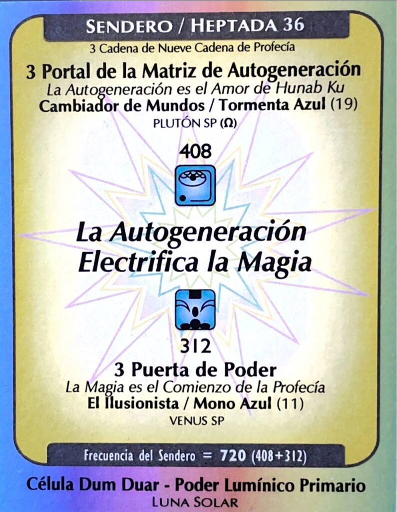A Senda de Tollan, V. 17, H. 11. UMB 279. > Josimar synchronotron: (5) Quinta magnitude do campo hipergravitacional organizador do campo de força lumínico Duar azul neutraliza a 6ª esfera mental: consciente Subliminar/atrator do universo paralelo. Núcleo energizante central (H.11 eixo equatorial). Quinta porta de Unidade do tempo radial esquerdo. Corresponde ao Descobridor (Guerrero): Quarto Assento de Poder de Hunab Ku 21 (força centrípeta interna): Corte da Inteligência Cósmica. A Inteligência Cósmica cria a célula de luz galáctica. A inteligência é a força centrípeta da totalidade cósmica: Inteligência é luz. Saturno Solar-Profético.