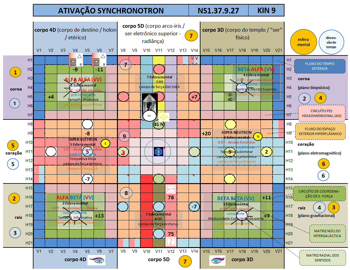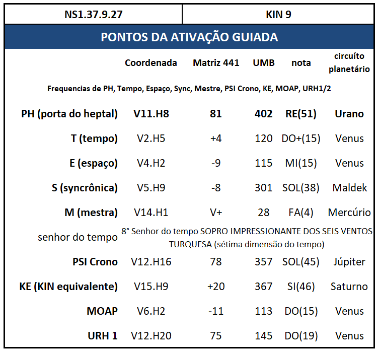 Hoje é NS1.37.9.27, KIN 9, lua solar vermelha. 9o KIN da onda encantada do(a) dragão, 1a onda do Tzolkin, 1a onda do castelo vermelho. castelo 1 do Tzolkin 53 do caminhante do céu magnético vermelho. anel 37 da tormenta rítmica azul. 9a lua deste anel, lua solar do jaguar. heptal 36 amarelo, o poder amadurece o fruto. Plasma LIMI, 6a porta do heptal, ativamos a 6a esfera mental com o hiperplasma HIPERNEUTRON. ativação cúbica no lado esquerdo do cubo. circuíto 1 galático karmico no hipercubo, fluxos interplanetários: o Circuito 1 é o abrangente circuito Exterior da Unidade, coordena as mudanças na manifestação Exterior da forma, Arquétipo a Curadora e o Compassivo, acessa o Conselho Mercurial do coração purificado.