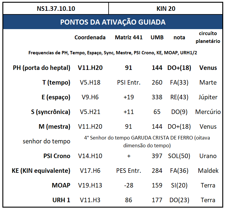 Hoje é NS1.37.10.10, KIN 20, sol ressonante amarelo. 7o KIN da onda encantada do(a) mago, 2a onda do Tzolkin, 2a onda do castelo vermelho. castelo 1 do Tzolkin 53 do caminhante do céu magnético vermelho. anel 37 da tormenta rítmica azul. 10a lua deste anel, lua planetária do cachorro. heptal 38 branco, a humildade refina a meditação. Plasma GAMA, 3a porta do heptal, ativamos a 3a esfera mental com o hiperplasma BETA-BETA. ativação cúbica na parte da frente do cubo. circuíto 10 galático karmico no hipercubo, fluxos interplanetários: o Circuito 10 mantém as Estações da Arca, coordena os seres protetores que guardam o tesouro escondido contido na Décima Primeira Dimensão, Arquétipos o Iluminado e o Transformador de Mundos, acessa o Conselho Plutoniano da Iluminação Catalítica.