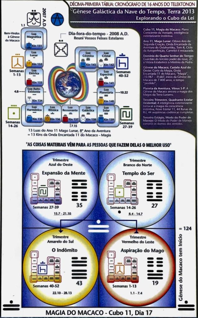7.4 Incluindo a incidência das Harmônicas Celestiais acessíveis através do Calendário de Treze Luas, o Telektonon estabelece ordens mais complexas de Harmônicas Celestiais que são históricas e interplanetárias por natureza. A introdução do Cubo da Lei, poder do 16 (4×4) ( ½ 32,1/4 64), amplifica o potencial para o mapeamento da transição biosfera-noosfera.