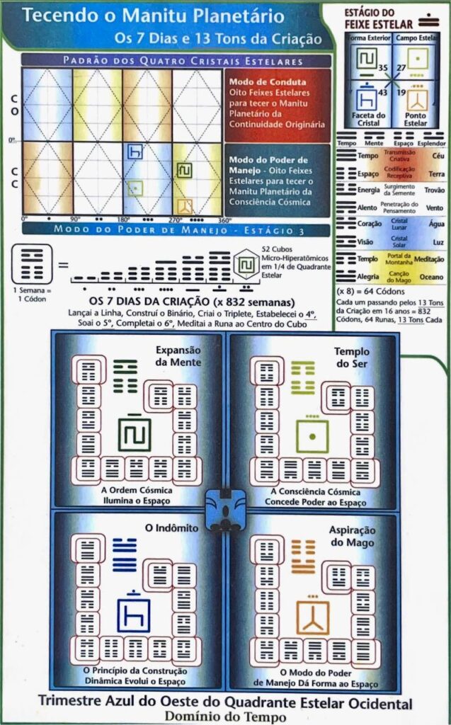 7.9 O padrão de simetria binária inversa da matriz 13:20 estendida sobre quatro placas ou funções de tempo estabelece o banco psi como o registro holonômico do Cérebro Galáctico codificado completamente na escala planetária. Como resultado, o banco psi contém o complexo completo do potencial vetor do tempo criando as Harmônicas Celestiais, acessíveis através dos códigos do Encantamento do Sonho