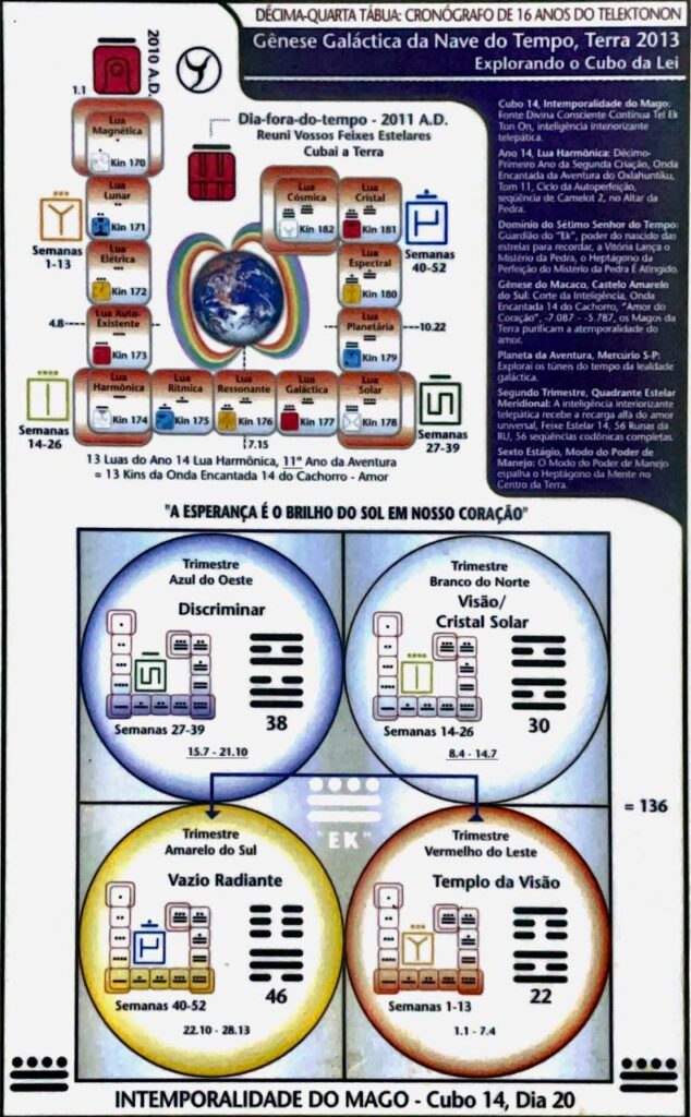 10.12 A reestruturação harmônica da ordem sincrônica é pré-requisito para a criação dos anéis circumpolares e para a restauração do sistema de tubo de fluxo interplanetário. As funções cromáticas restaurativas do tempo são funções sociais e também telepáticas e mentais. A restauração consciente da biosfera cria uma ordem social harmônica cujos padrões quadridimensionais assemelham-se à ordem orgânica reestruturada harmonicamente.