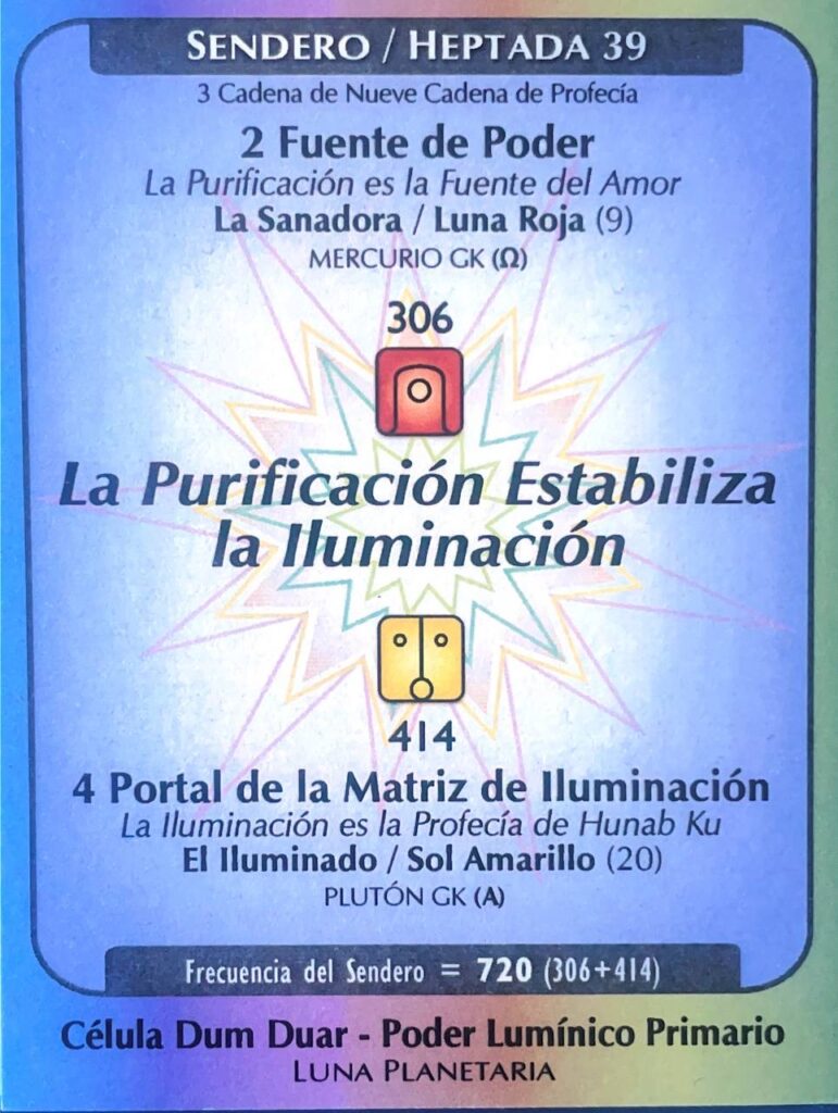 G (KIN guia), V. 8, H. 5. UMB 294. (-21) Vigésima-Primeira magnitude do fluxo do espaço externo sublima o hiperplasma Alfa-Alfa da Criação Cósmica (na 1ª dimensão do tempo exterior). Campo de força do samadhi profundo (1D) sublimado pelo campo de força (7D) do Perceptor Holomental radializado radiosonicamente: Comando Cósmico Descendente. Corresponde ao Hierofante (Enlaçador de Mundos): Primeira Fonte de Poder de Hunab Ku 21 na Corte do Avatar (UMB 291). Ativado pela carga térmica ascendente Dum Kuali (UMB 405) “calor primario”. A morte é a fonte do conhecimento. Marte Galáctico-Kármico.