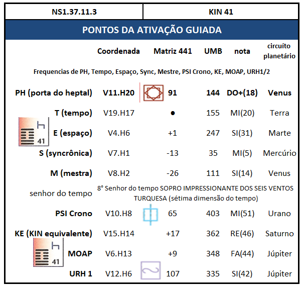 Hoje é NS1.37.11.3, KIN 41, dragão lunar vermelho. 2o KIN da onda encantada do(a) sol, 4a onda do Tzolkin, 4a onda do vermelho. castelo 1 do Tzolkin 53 do caminhante do céu magnético vermelho. anel 37 da tormenta rítmica azul. 11a lua deste anel, lua espectral da serpente. heptal 41 vermelho, o conhecimento inicia a visão. Plasma GAMA, 3a porta do heptal, ativamos a 3a esfera mental com o hiperplasma BETA-BETA. ativação cúbica na parte da frente do cubo. circuíto 9 galático karmico no hipercubo, fluxos interplanetários: o Circuito 9 é o mantenedor das memórias arquetípicas da consciência oceânica, coordena o interior autoexistente do núcleo da Nona Dimensão do coração radiante, Arquétipos Yogue/Yoguine e a Força Primordial, acessa o Conselho Netuniano da Memória autorreflexiva.