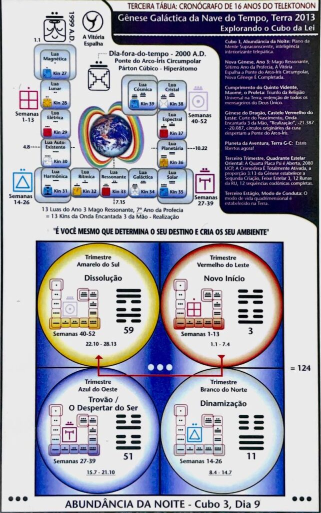 7.4 Incluindo a incidência das Harmônicas Celestiais acessíveis através do Calendário de Treze Luas, o Telektonon estabelece ordens mais complexas de Harmônicas Celestiais que são históricas e interplanetárias por natureza. A introdução do Cubo da Lei, poder do 16 (4×4) ( ½ 32,1/4 64), amplifica o potencial para o mapeamento da transição biosfera-noosfera.