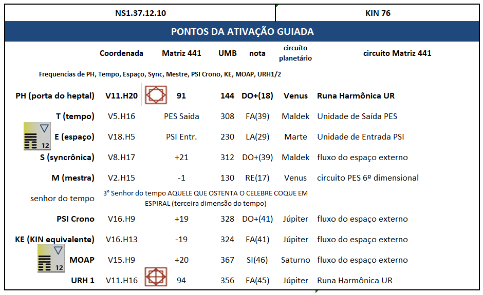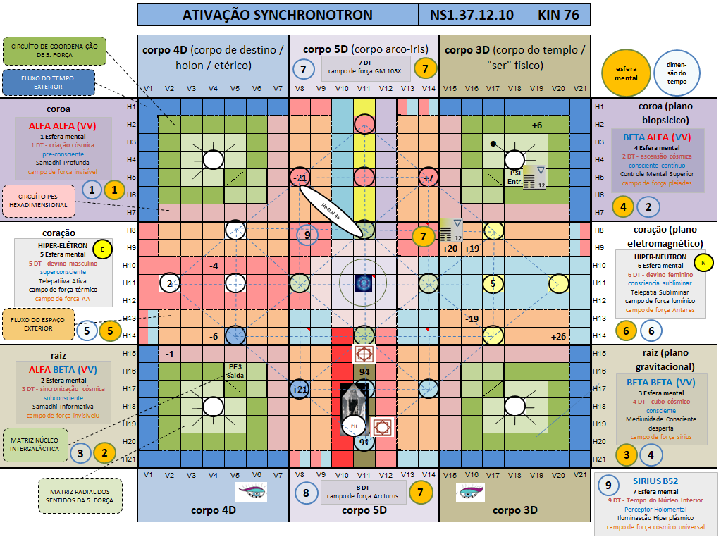Hoje é NS1.37.12.10, KIN 76, guerreiro espectral amarelo. 11o KIN da onda encantada do(a) enlaçador, 6a onda do Tzolkin, 2a onda do castelo branco. castelo 2 do Tzolkin 53 do caminhante do céu magnético vermelho. anel 37 da tormenta rítmica azul. 12a lua deste anel, lua cristal do coelho. heptal 46 branco, a humildade refina a meditação. Plasma GAMA, 3a porta do heptal, ativamos a 3a esfera mental com o hiperplasma BETA-BETA. ativação cúbica na parte da frente do cubo. circuíto 7 solar profético no hipercubo, fluxos interplanetários: 0 Circuito 7, o traçado cristal circundando a Nona Dimensão do Tempo, coordena o acesso transcendente do registro Alma/Akásico, Arquétipos o Sonhador e o Descobridor de Caminhos, acessa o Conselho Saturnino da Inteligência Sonhadora.