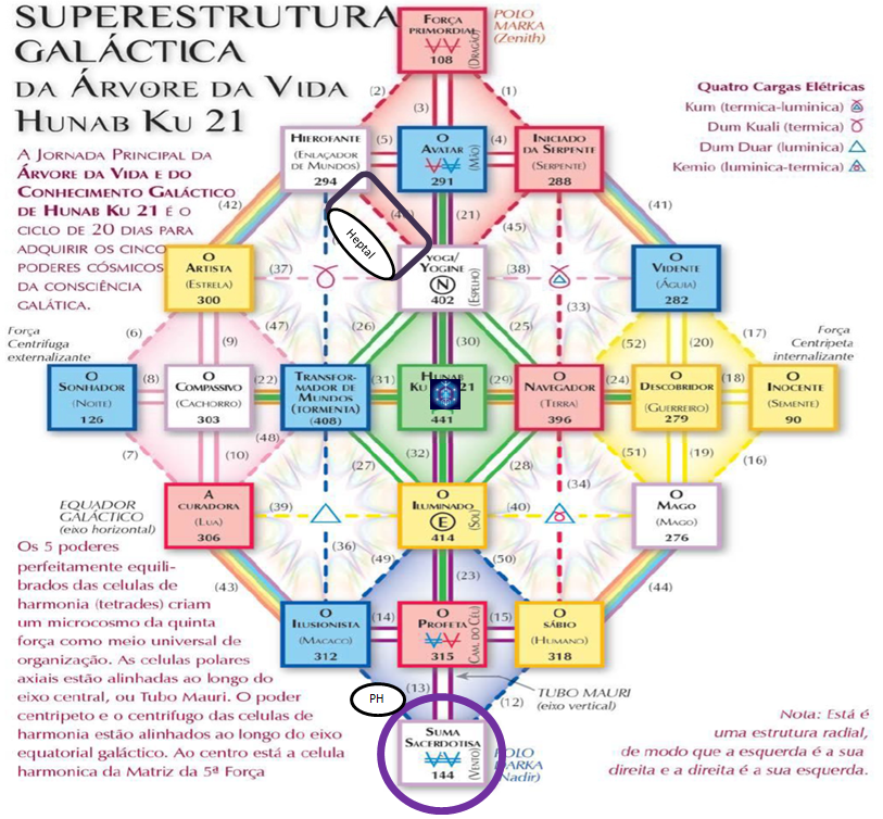 PH (porta do heptal), V. 11, H. 20. UMB 144. Runa Harmônica UR 91: O Todo da Arte Galáctica Define o Espaço. 4ª Oitava: Oitava do Todo da Arte Galáctica. Runa da Fila 12. Segunda porta de Unidade do tempo vertical ascendente. Corresponde a Suma Sacerdotisa (Vento): Segunda Porta de luz de Hunab Ku 21. Abre a Porta da luz Universal da Corte do Profeta (UMB 315) onde é armazenada a profecía cósmica. A Suma Sacerdotisa ascende ao Polo Sul (Darka) como Alento Cósmico e ascende como profecía. Gera o hiperplasma Beta-Beta estimulando a mediunidade do consciente desperto e sela o plasma radial Gama. Abre a Terceira porta do heptal: A Porta do Misterio. Urano Solar-Profético.
