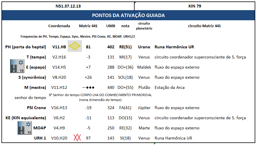 Hoje é NS1.37.12.13, KIN 79, tormenta magnética azul. 1o KIN da onda encantada do(a) tormenta, 7a onda do Tzolkin, 3a onda do castelo branco. castelo 2 do Tzolkin 53 do caminhante do céu magnético vermelho. anel 37 da tormenta rítmica azul. 12a lua deste anel, lua cristal do coelho. heptal 46 branco, a humildade refina a meditação. Plasma LIMI, 6a porta do heptal, ativamos a 6a esfera mental com o hiperplasma HIPERNEUTRON. ativação cúbica no lado esquerdo do cubo. circuíto 10 solar profético no hipercubo, fluxos interplanetários: o Circuito 10 mantém as Estações da Arca, coordena os seres protetores que guardam o tesouro escondido contido na Décima Primeira Dimensão, Arquétipos o Iluminado e o Transformador de Mundos, acessa o Conselho Plutoniano da Iluminação Catalítica.
