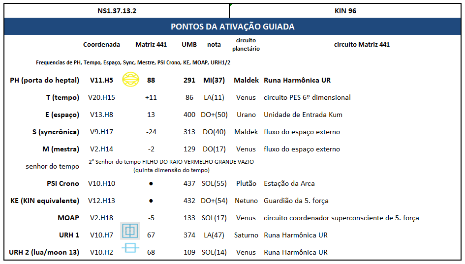 Hoje é NS1.37.13.2, KIN 96, guerreiro harmônico amarelo. 5o KIN da onda encantada do(a) humano, 8a onda do Tzolkin, 4a onda do castelo branco. castelo 2 do Tzolkin 53 do caminhante do céu magnético vermelho. anel 37 da tormenta rítmica azul. 13a lua deste anel, lua cósmica da tartaruga. heptal 49 vermelho, o conhecimento inicia a visão. Plasma SELI, 2a porta do heptal, ativamos a 2a esfera mental com o hiperplasma ALFA-BETA. ativação cúbica na parte de baixo do cubo. circuíto 7 solar profético no hipercubo, fluxos interplanetários: 0 Circuito 7, o traçado cristal circundando a Nona Dimensão do Tempo, coordena o acesso transcendente do registro Alma/Akásico, Arquétipos o Sonhador e o Descobridor de Caminhos, acessa o Conselho Saturnino da Inteligência Sonhadora.