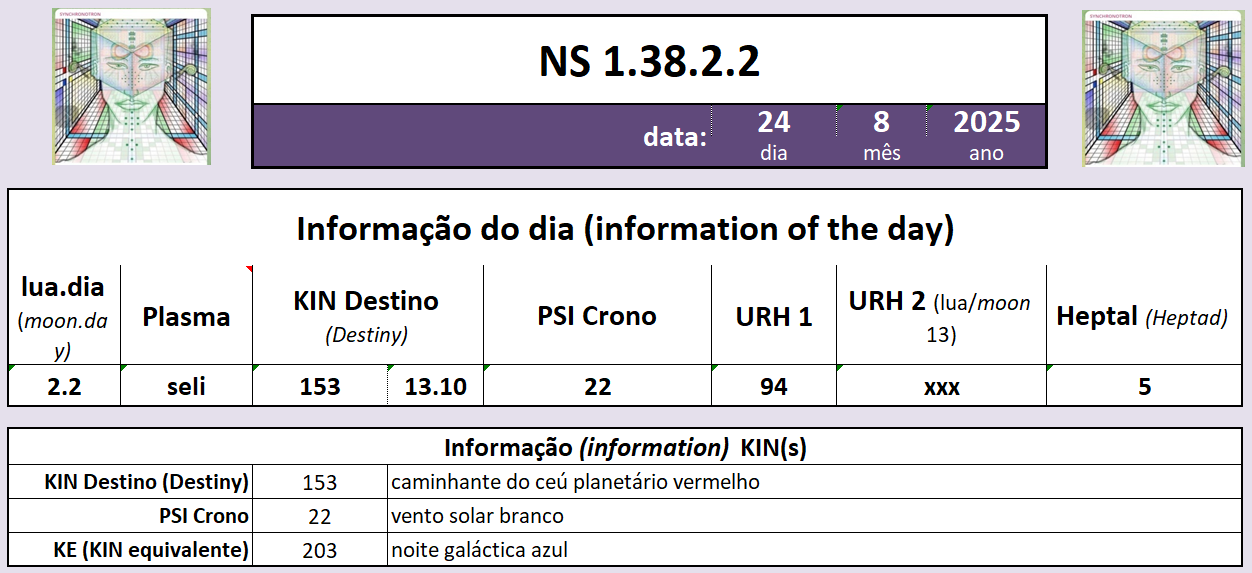 Hoje é NS 1.38.2.2, KIN 153, caminhante do ceú planetário vermelho, 10. KIN da onda encantada do(a) semente, 12. onda do Tzolkin, 4. onda do castelo azul, castelo 3 do Tzolkin.