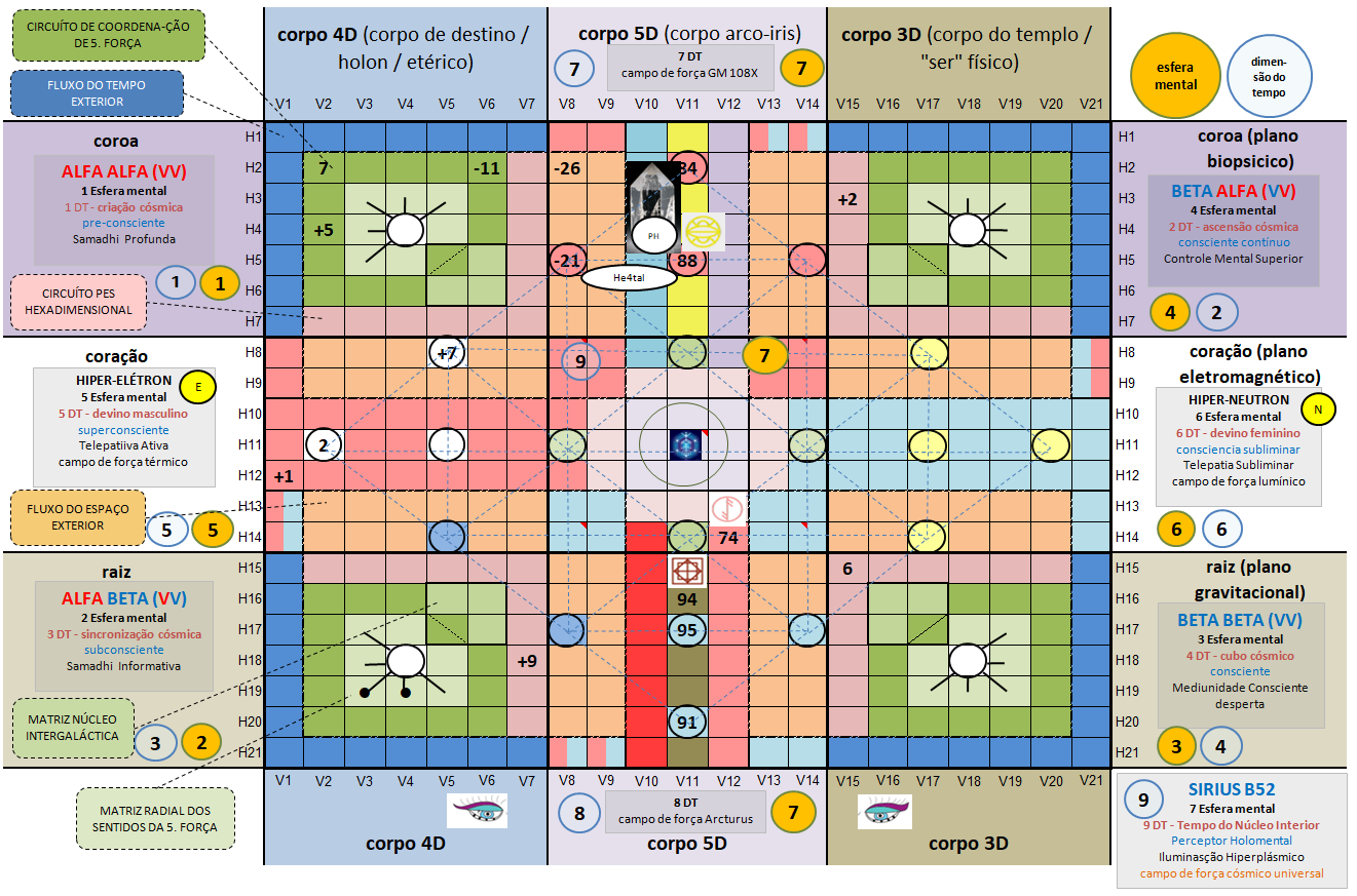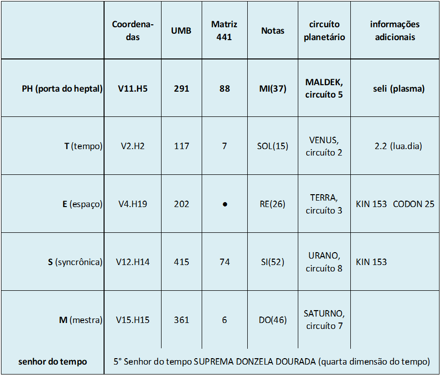 T (tempo), V.2, H.2. UMB 117. (7) Sétima magnitude do circuito coordenador superconsciente de quinta força do canal Alfa-Alfa. Ressonador interno sintonizando e neutralizando os sinais do tempo 5D ao núcleo radial dos sentidos da Criação Cósmica. Segunda porta da terceira diagonal de Unidade.
