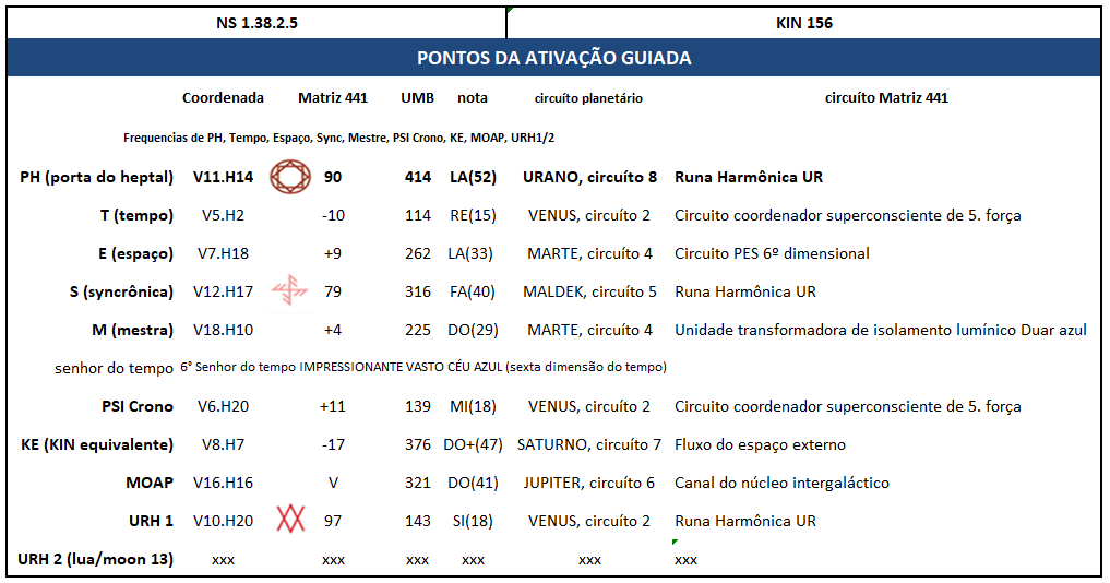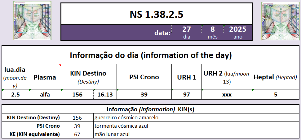 Hoje é NS 1.38.2.5, KIN 156, guerreiro cósmico amarelo, 13. KIN da onda encantada do(a) semente, 12. onda do Tzolkin, 4. onda do castelo azul, castelo 3 do Tzolkin.