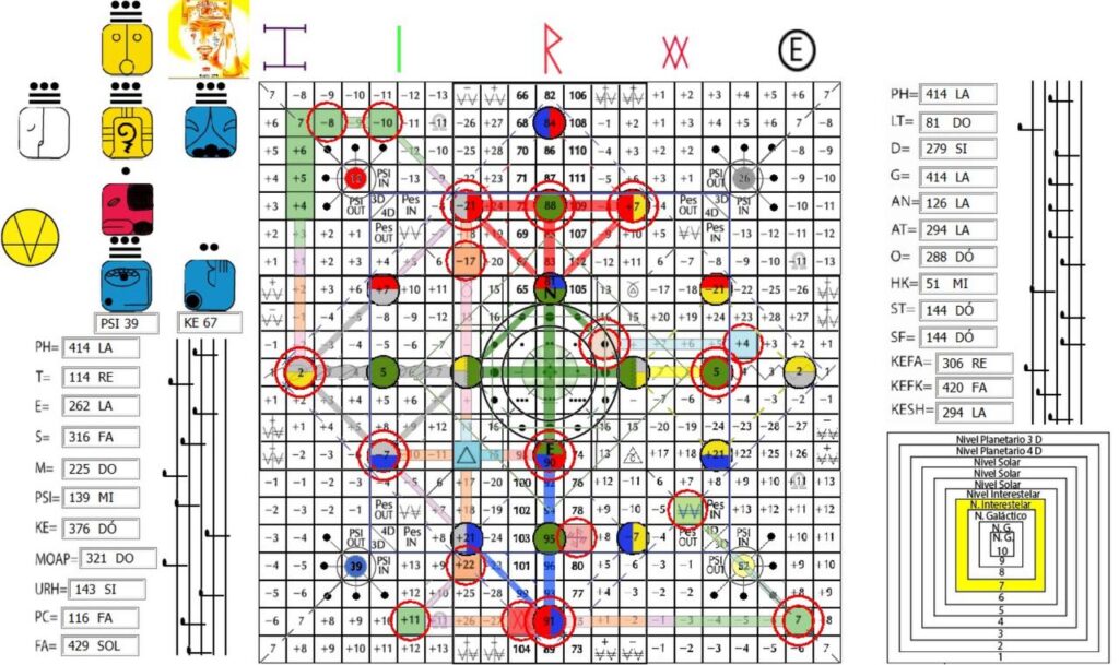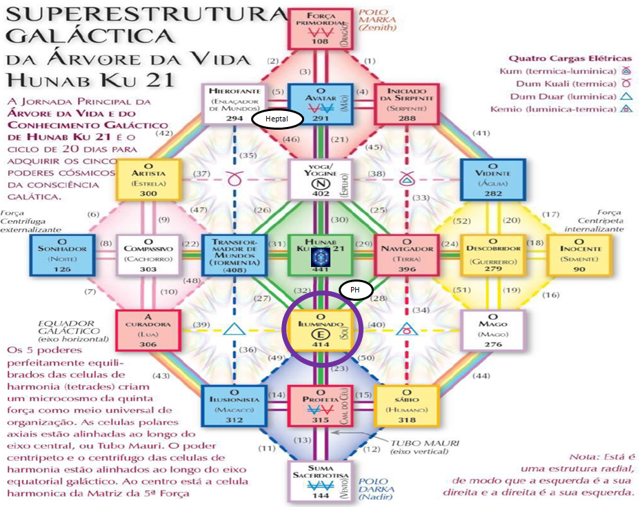 HK (Hunab Ku), V.1, H.11. UMB 51. (1) Primeira magnitude do campo hipergravitacional organizador do campo de força térmico Kuali vermelho neutraliza a 5ª esfera mental: superconsciente. Núcleo energizante central (H.11 eixo equatorial). Primeira porta de Unidade do tempo radial direito.