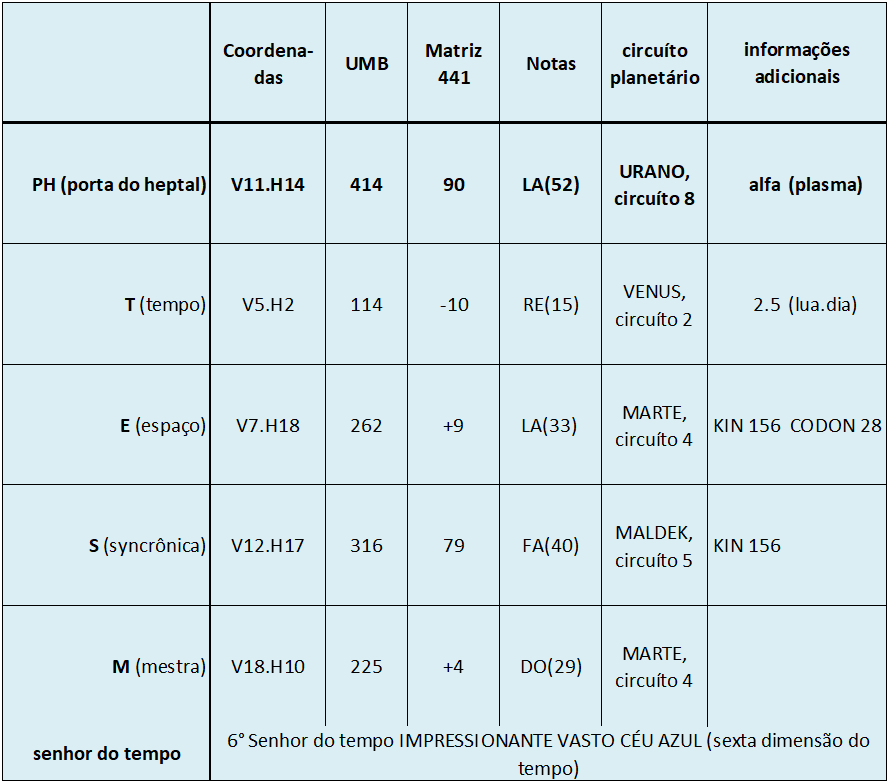 T (tempo), V.5, H.2. UMB 114. (-10) Décima magnitude do circuito coordenador superconsciente de quinta força do canal Alfa-Alfa. Sublimar e transferir os sinais internos do tempo 5D da manifestação planetária ao núcleo radial dos sentidos da Criação Cósmica.