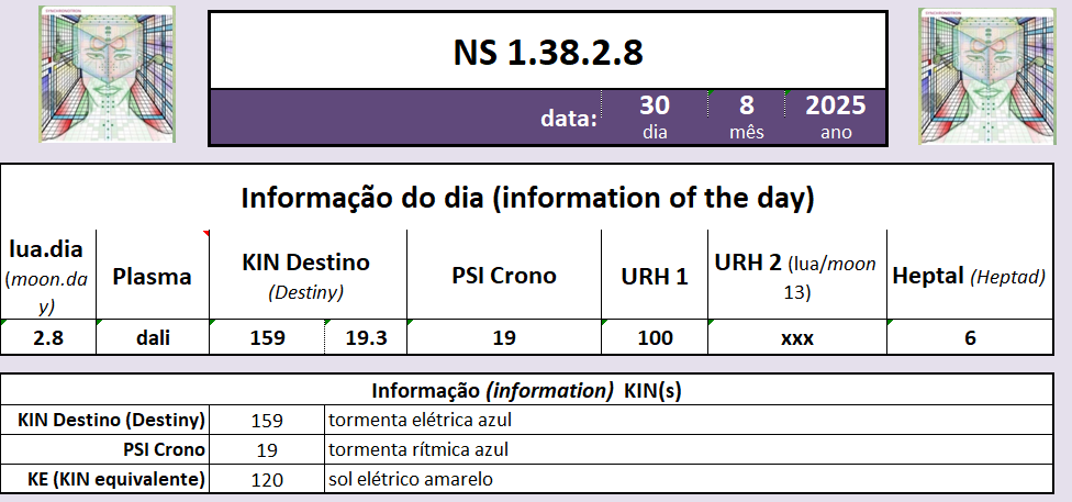 Hoje é NS 1.38.2.8, KIN 159, tormenta elétrica azul, 3. KIN  da onda encantada do(a) terra, 13. onda do Tzolkin, 1. onda do castelo amarelo, castelo 4 do Tzolkin.