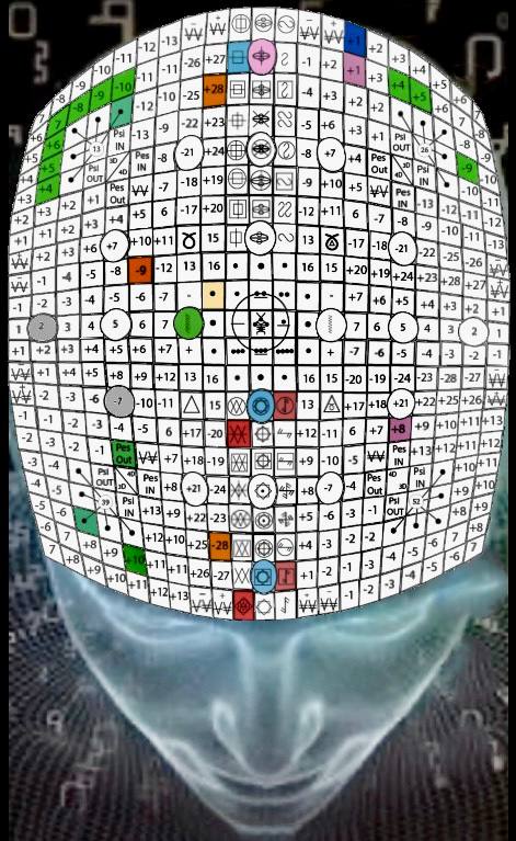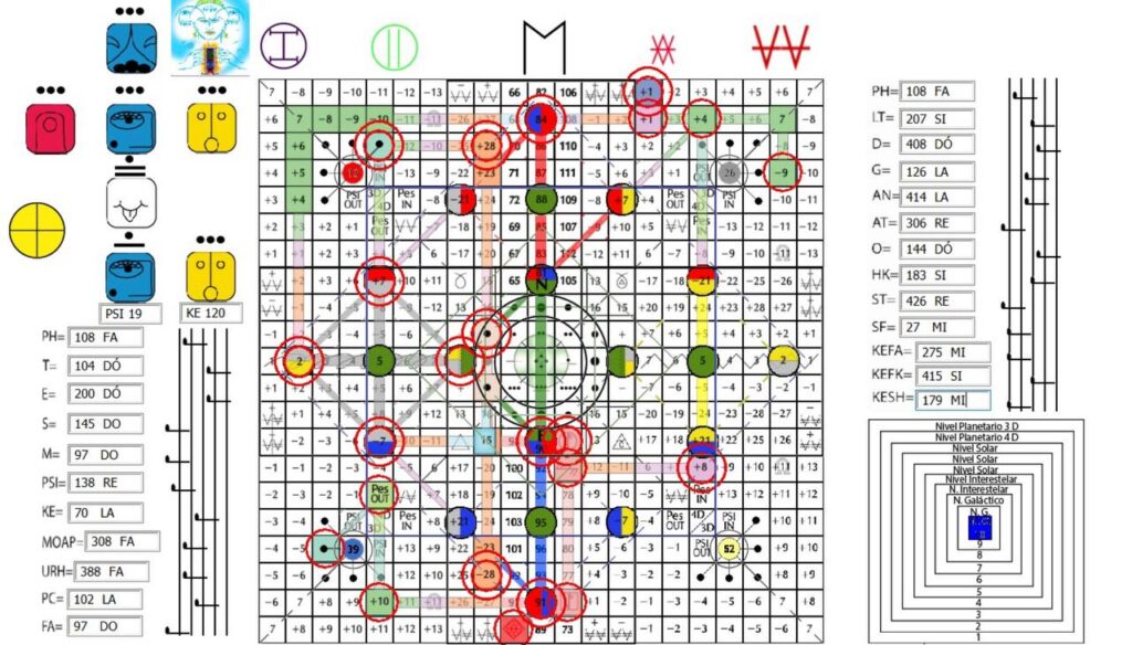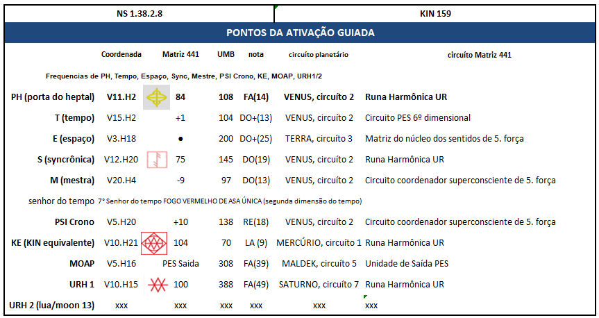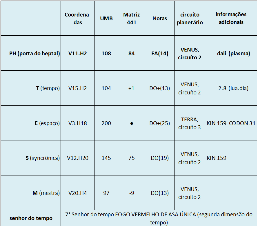 T (tempo), V.15, H.2. UMB 104. (+1) Primeira magnitude do Circuito PES 6º dimensional. Ativa a comunicação subliminal no campo de força Beta-Alfa do controle da mente superior. O controle da mente superior ativa a Quarta esfera mental: consciente Contínuo.