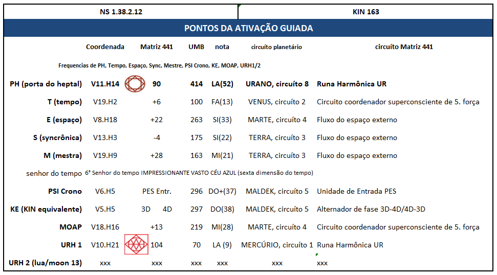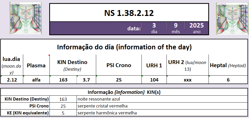 Hoje é NS 1.38.2.12, KIN 163, noite ressonante azul, 7. KIN da onda encantada do(a) terra, 13. onda do Tzolkin, 1. onda do castelo amarelo, castelo 4 do Tzolkin.