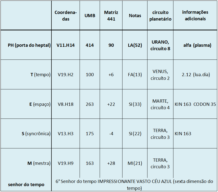 T (tempo), V.19, H.2. UMB 100. (+6) Sexta magnitude do circuito coordenador superconsciente de quinta força do canal Beta-Alfa. Ativar e transferir os sinais internos do tempo 5D da igualdade rítmica ao núcleo radial dos sentidos da Ascensão Cósmica.