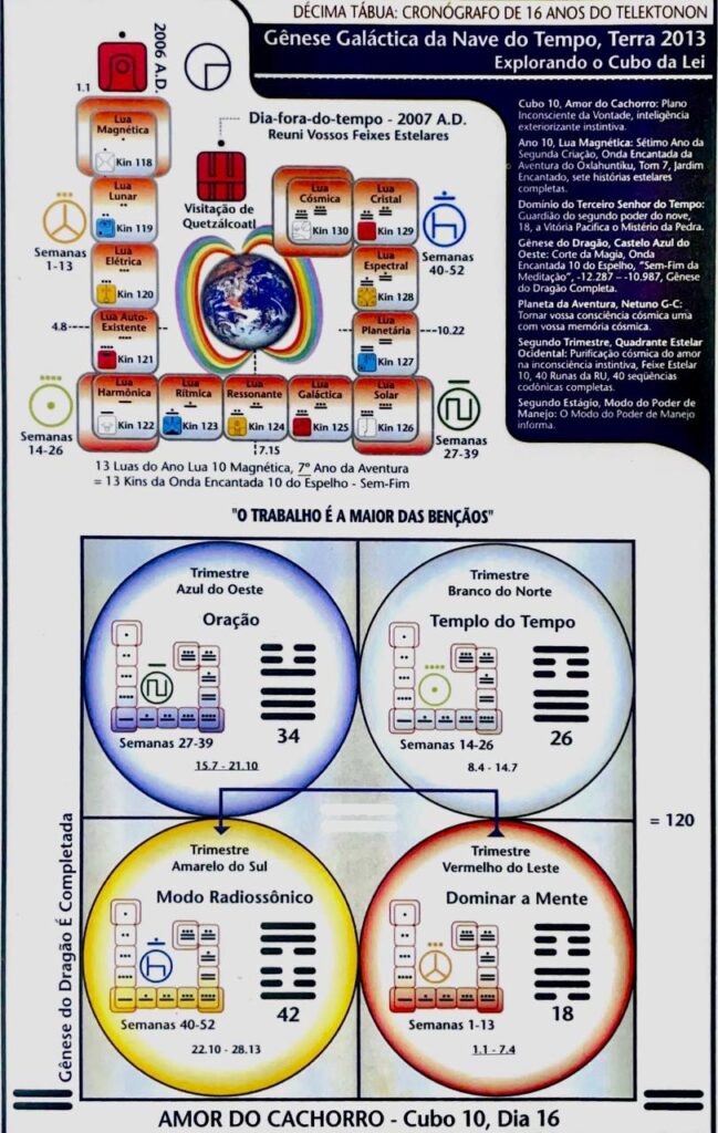 7.4 Incluindo a incidência das Harmônicas Celestiais acessíveis através do Calendário de Treze Luas, o Telektonon estabelece ordens mais complexas de Harmônicas Celestiais que são históricas e interplanetárias por natureza. A introdução do Cubo da Lei, poder do 16 (4×4) ( ½ 32,1/4 64), amplifica o potencial para o mapeamento da transição biosfera-noosfera.