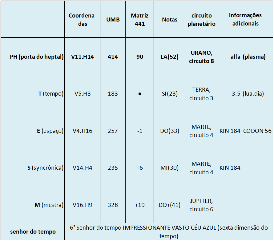 E (espaço), V.4, H.16. UMB 257. (-1) Primeira magnitude do circuito coordenador superconsciente de quinta força do canal Alfa-Beta. Sublimar e transferir os sinais internos do tempo 5D do propósito magnético ao núcleo radial dos sentidos da Sincronização Cósmica.
