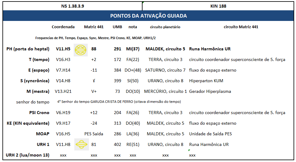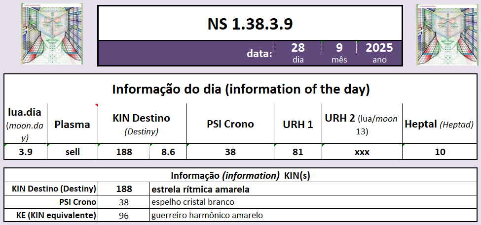 Hoje é NS 1.38.3.9, KIN 188, estrela rítmica amarela, 6. KIN da onda encantada do(a) noite, 15. onda do Tzolkin, 3. onda do castelo amarelo, castelo 4 do Tzolkin.