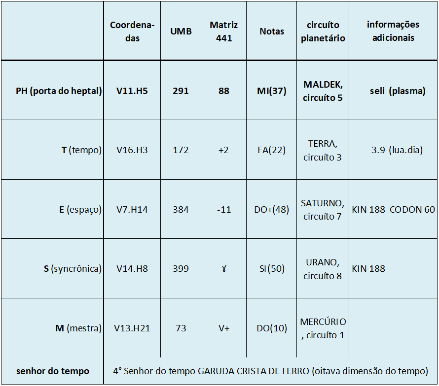 E (espaço), V. 7, H. 14. UMB 384. (-11) Décima primeira magnitude do fluxo do espaço externo sublima o hiperplasma Alfa-Beta da Sincronização Cósmica (na 3ª dimensão do tempo exterior). Campo de força do samadhi informativo (3D) ativado pelo campo de força térmico Kuali vermelho da paranormalidade superconsciente (5D).