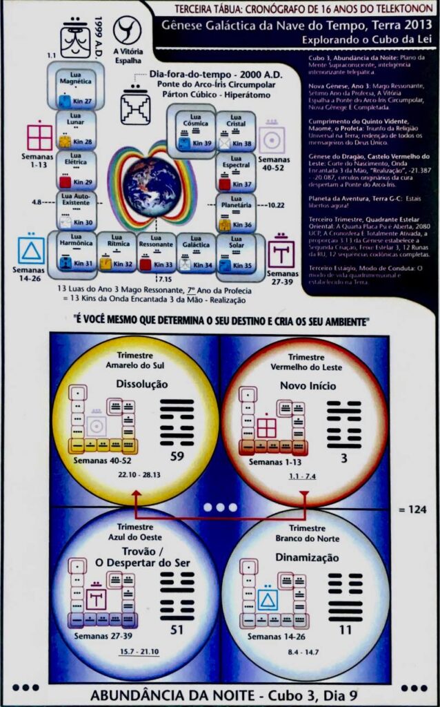 8.6 A formulação da Lei do Tempo e a aplicação das ferramentas corretivas quadridimensionais iniciam o restabelecimento da relação correta entre a AC (Continuidade Aboriginal) e a CA (Advertência Cósmica). Individual e coletivamente, este processo constitui o programa central da “reeducação magnética” da humanidade, e é geralmente definida como “yoga”