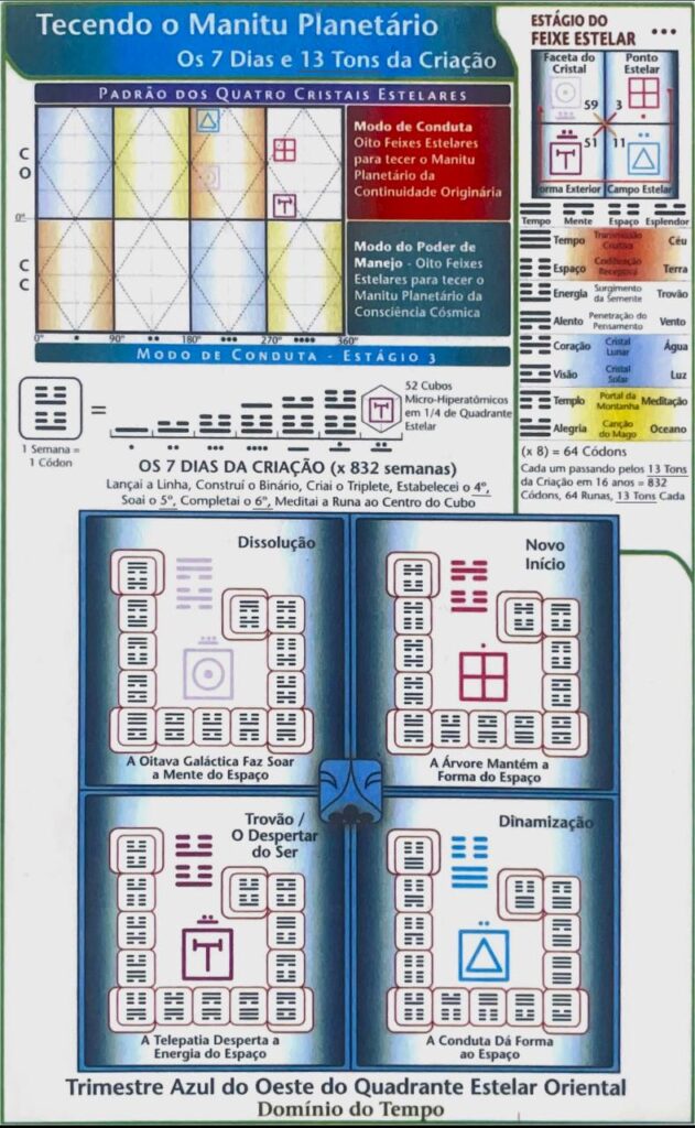 8.13 Tempo, espaço e mente são matrizes numéricas entrelaçadas que se equalizam mutuamente. Juntas essas matrizes constituem a linguagem, a gramática, e o vocabulário de frequências telepáticas que estão ocorrendo constantemente, evoluindo o universo momento a momento através de diversos padrões de sincronicidade sempre mutante.
