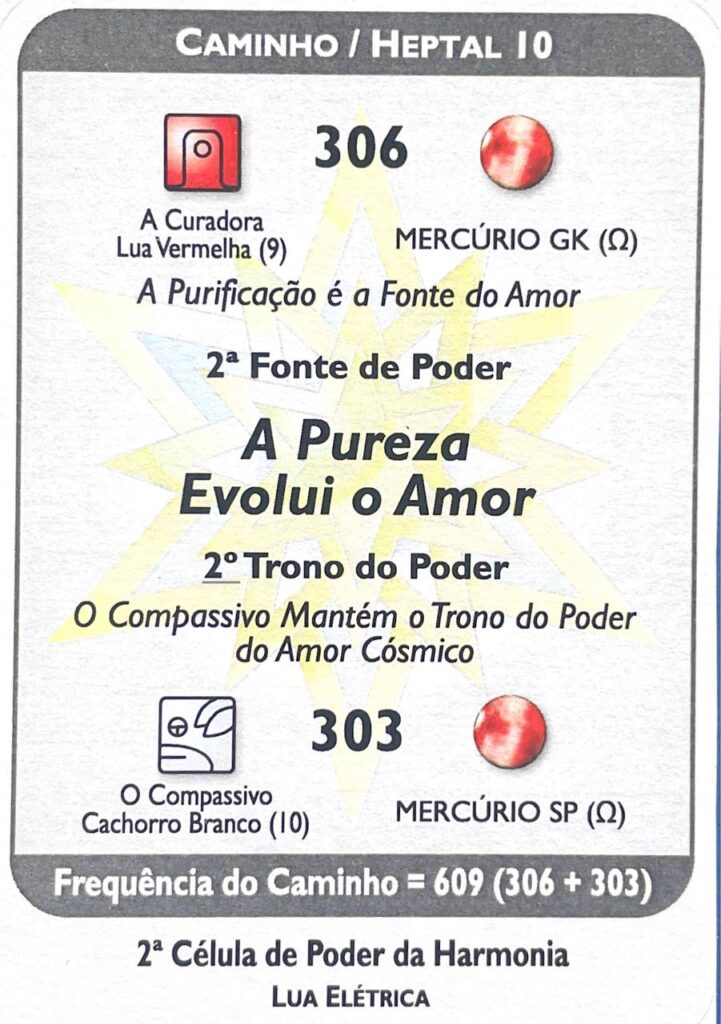 O Kin Destino, V.5, H.14. UMB 306. (-7) Sétima magnitude do fluxo do espaço externo sublima o hiperplasma Alfa-Beta da Sincronização Cósmica (na 3ª dimensão do tempo exterior). Campo de força do samadhi informativo (3D) sublimado pelo campo de força térmico Kuali vermelho da paranormalidade superconsciente (5D). Corresponde a Curadora (UMB 306 Lua): segunda Fonte de Poder de Hunab Ku 21 na Corte do Compasivo (UMB 303 Cachorro). Ativado pela carga elétrica lumínica Dum Duar “luz primaria” (UMB 411). A Curadora é a fonte do amor. Mercurio Galáctico-Kármico.