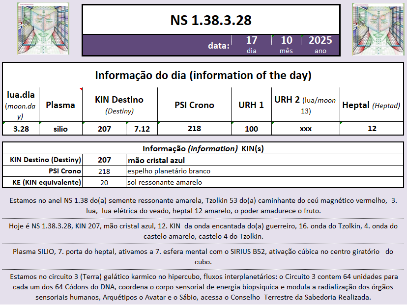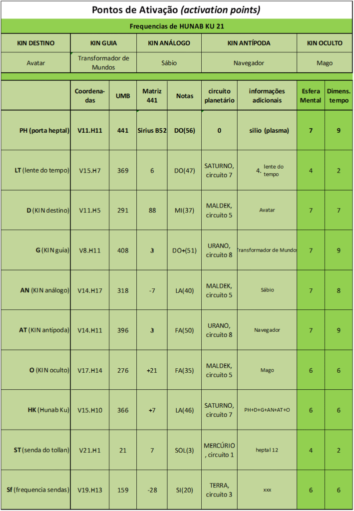 O Kin Oculto,  V. 17, H. 14. UMB 276. (+21) Vigésima-Primeira magnitude do fluxo do espaço externo. Ativa o hiperplasma Beta-Beta do Cubo Cósmico (na 4ª dimensão do tempo exterior). Campo de força da mediunidade do consciente desperto (4D). Ativado pelo campo de força lumínico Duar azul do consciente Subliminar (6D). Corresponde ao Mago: Quarta Porta de Poder de Hunab Ku 21 na Corte do Descobridor (UMB 279). Ativado pela linha de força lumínico/térmica Kemio “luz do calor interior” (UMB 393). A atemporalidade é o inicio da inteligência. Maldek Solar-Profético.