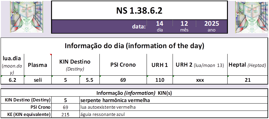 Estamos no anel NS 1.38 do(a) semente ressonante amarela, Tzolkin 54 do(a) mago lunar branco, 6. lua, lua rítmica do lagarto, heptal 21 vermelho, o conhecimento inicia a visão.