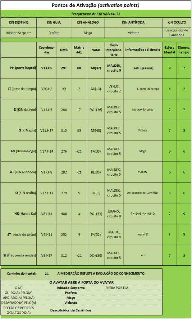 AN (KIN análogo), V. 17, H. 14. UMB 276. (+21) Vigésima-Primeira magnitude do fluxo do espaço externo. Ativa o hiperplasma Beta-Beta do Cubo Cósmico (na 4ª dimensão do tempo exterior). Campo de força da mediunidade do consciente desperto (4D). Ativado pelo campo de força lumínico Duar azul do consciente subliminar (6D). Corresponde ao Mago: Quarta Porta de Poder de Hunab Ku 21 na Corte do Descobridor (UMB 279). Ativado pela linha de força lumínico/térmica Kemio “luz do calor interior” (UMB 393). A atemporalidade é o inicio da inteligência. Maldek Solar-Profético.