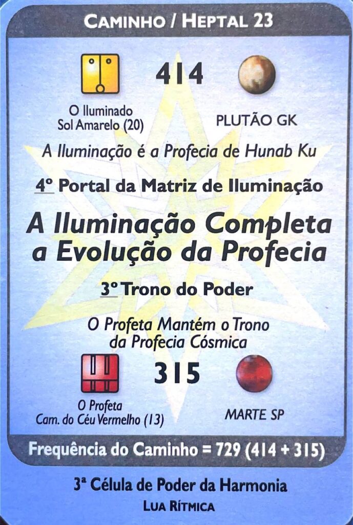 O Kin Guia, V. 20, H. 11. UMB 90. (2) Segunda magnitude do campo hipergravitacional organizador do campo de força lumínico Duar azul neutraliza a 6ª esfera mental: consciente Subliminar/atrator do universo paralelo. Núcleo energizante central (H.11 eixo equatorial). Segunda porta de Unidade do tempo radial esquerdo. Corresponde ao Inocente (Semente): Quarta Porta de luz de Hunab Ku 21 (extremidade centrípeta). Internalizar o processo centrípeto onde as cargas elétricas do hipernêutron e a luz primaria (Dum Duar) combina para criar a força con- sciente Subliminar da Inteligencia Cósmica que abre a Corte do Descobridor (UMB 279). Controla o poder da consciência universal para evoluir os poderes da inteligência cósmica. Júpiter Galáctico-Kármico.