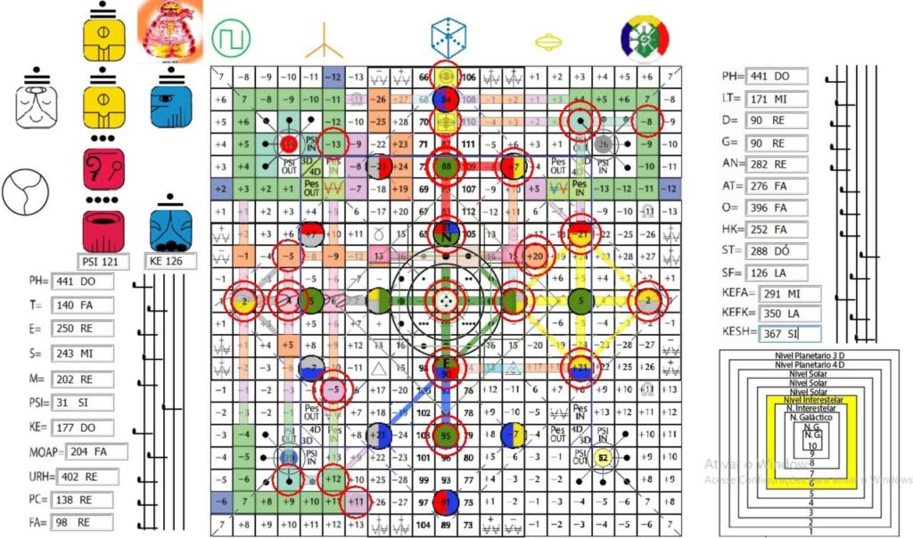 PH, V. 11, H. 11. UMB 441. 9ª Estação da Arca: Noé, Pacal (e Valum) Votan—arquetipo dos mensageiros do tempo e do sistema do Cubo. Canal 11º dimensional a partir do qual se originam a totalidade dos padrões do sistema de pensamento e vida Galáctica do cubo. A partir daqui para o corpo calloso flui o hiperplasma concentrado radialmente Sirio B-52/Elemento 113. Hunab Ku 21: Mago do Infinito. Matriz central do canal do universo, a luz-fotón-ciclón do poder de quinta força. Assento da Unidade da totalidade. A partir do portal de Hunab Ku 21 é gerado o hiperplasma Sirio B-52/Elemento 113 que estimula os estados de consciência e percepção radial e ativa as forças centrípeta e centrífuga como as energias cósmicas primarias. 11ª Porta de Unidade: Omnidirecionalidade.