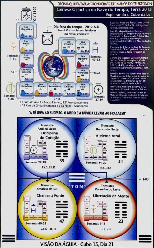 O Kin Antípodas, V. 17, H. 14. UMB 276. (+21) Vigésima-Primeira magnitude do fluxo do espaço externo. > Josimar synchronotron: Ativa o hiperplasma Beta-Beta do Cubo Cósmico (na 4ª dimensão do tempo exterior). Campo de força da mediunidade do consciente desperto (4D). Ativado pelo campo de força lumínico Duar azul do consciente Subliminar (6D). Corresponde ao Mago: Quarta Porta de Poder de Hunab Ku 21 na Corte do Descobridor (UMB 279). Ativado pela linha de força lumínico/térmica Kemio “luz do calor interior” (UMB 393). A atemporalidade é o inicio da inteligência. Maldek Solar-Profético.